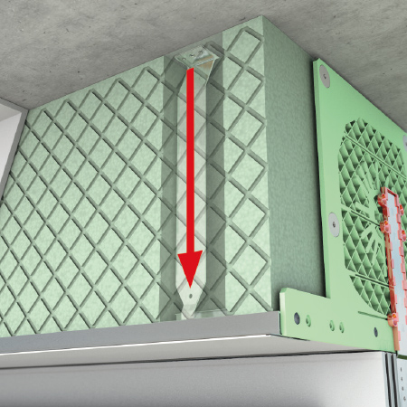 Ojačanje koje je posebno konstruisano integrisano rešenje na strani kutije. Fiksiranje za plafon je veoma lako zahvaljujući posebnoj geometriji u gornjem delu.